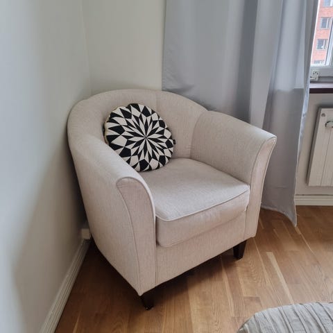 Beige fåtölj med armstöd och träben