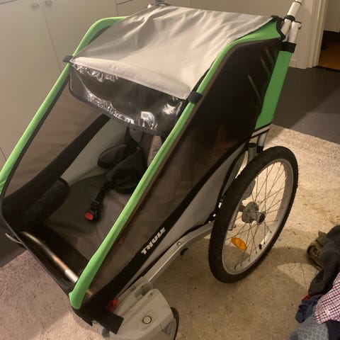 En toppenvagn på alla vis, smidig och att lätt att köra. Vi har använt den som vardagsvagn och löpvagn till och från olika aktiviteter. Förvarad inomhus, ej solblekt. Inköpt våren 2025. Väldigt fint skick förutom att det finns lite slitage och färg från våra vita dörrkarmar på sidorna, därav priset (se bilder). Den går in genom alla vanliga dörröppningar men vi har inte alltid prickat helt rätt, därav märkena. Ingår Thule bumper bars 2 st och Thule regnskydd i priset.