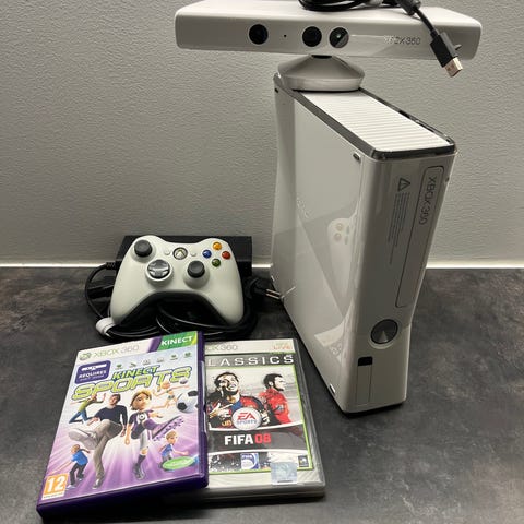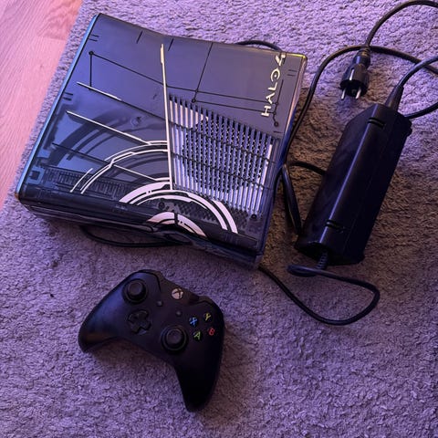 Xbox 360 konsol i Star Wars-tema med tillhörande röd trådlös handkontroll. Konsolen har standardanslutningar för ström och HDMI. Handkontrollen är designad för Xbox 360 och har färgglada knappar och två analoga spakar.