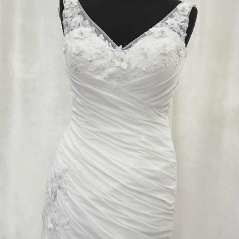 Elegant brudklänning med en tidlös design. Klänningen har en böljande silhuett och en fastmonterad kappa. Den har en dragkedja med dekorationsknappar. Oanvänd. Köpt för 4000 kronor, säljer för 2000