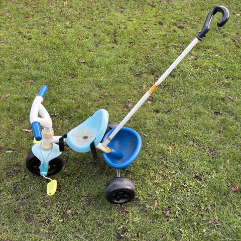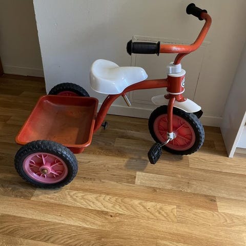 Röd trehjuling med flak av märket Winther. Sparsamt använd inomhus.