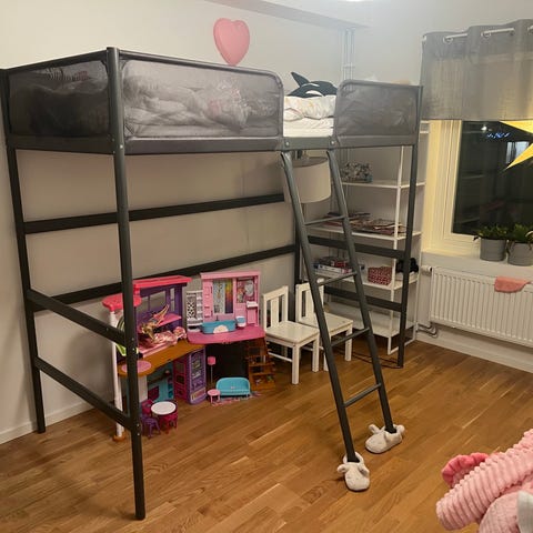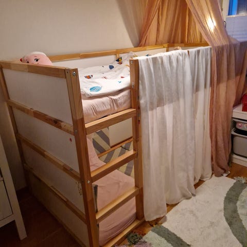 Finns ett egensytt draperi i rosa som medföljer om man önskar för att kunna göra kojor mm. samt krokar. Vi har satt fast en list för att detta ska kunna sitta uppe som sitter kvar så den får man ta loss om man ej vill ha draperi.