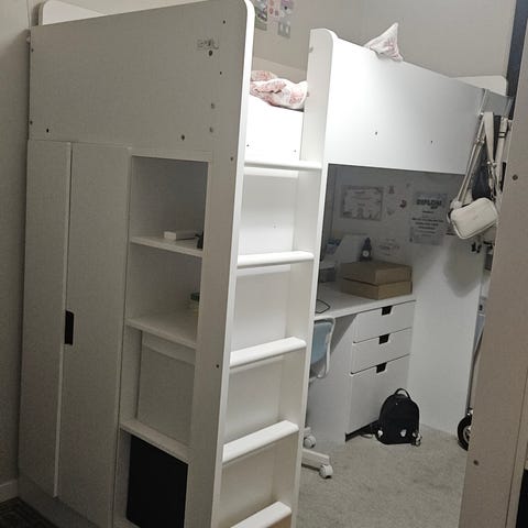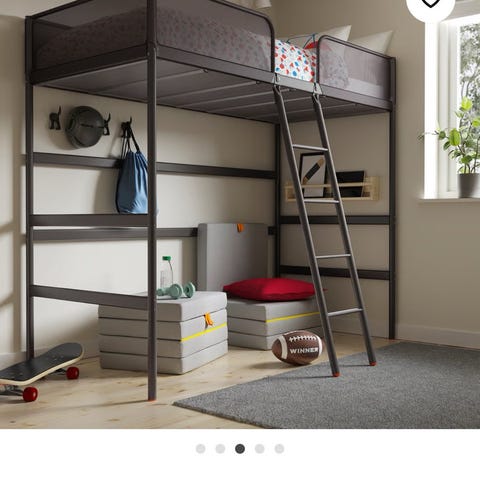 IKEA Loftsäng i trä. Sängen är utformad som en loftsäng med stege och har en naturlig träfärg. Passar för barn och erbjuder en höjd som möjliggör utrymme under sängen för förvaring eller lek.