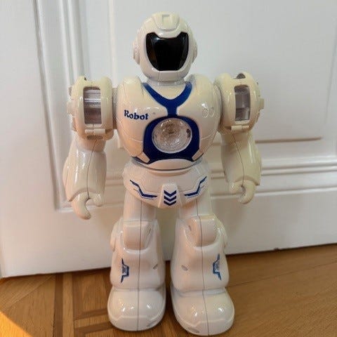 Robot från Top Toy som rör sig, låter och lyser. Kan tex göra kullebyttor och volter när man håller den i händerna. En bit på foten saknas (se bild 4) varför priset är lågt.