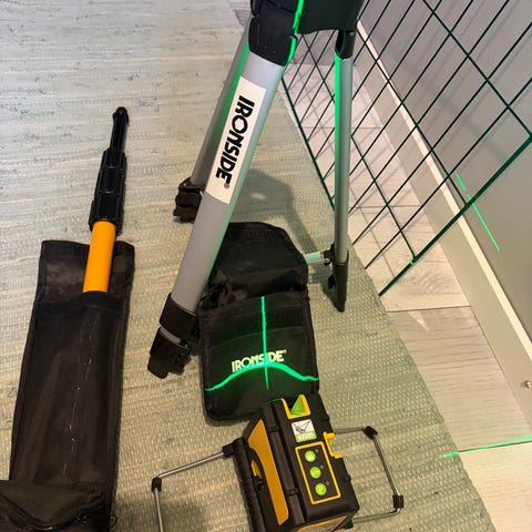 Ironside Laserlinjal med stativ som projicerar gröna laserlinjer i korsform. Utrustad med justerbart stativ för stabil placering. Används för exakta mätningar och uppriktningar i bygg- och hantverksarbeten.