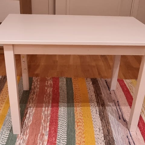 IKEA sundvik barnbord och två stolar i vitt. Har märken efter användning, men är fortfarande fina och har mycket kvar att ge. Både bord och stolar är stabila. Bordet är 76x50cm.
