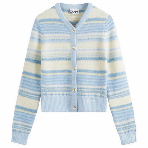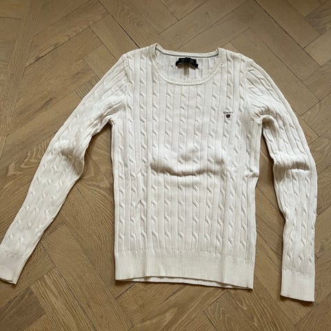 Elegant Gant-kofta i en mjuk viskosblandning stilren färgkombination av benvitt och mörkblått. Koftan har en klassisk krage, knäppning framtill med guldfärgade knappar och två praktiska fickor.