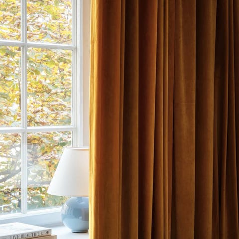 Sammetsgardin från Gotain med tungt vackert fall (använts med Kirsch takskena). Brun med fina skiftningar i olika ljus. Dämpar ljud.