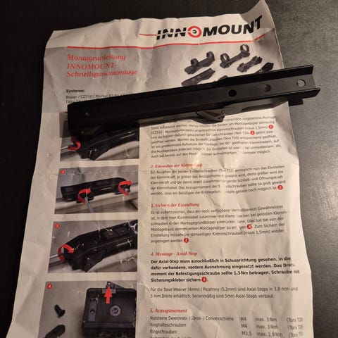 Följer med en 45° picatinny bit för lättare montering, har man en picatinny eller Weaver skena av normal längd på bössan så är det inga problem att montera.