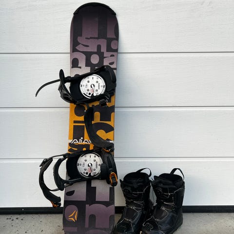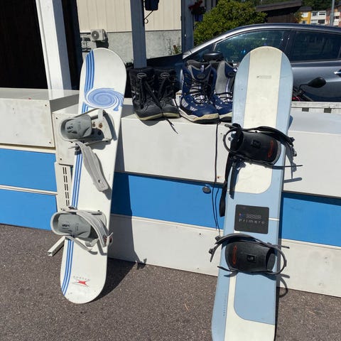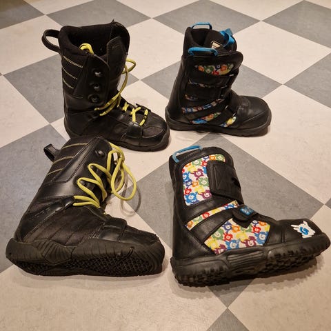 Två par snowboardskor, stl 42 & 42,5, ett par Nordica slalompjäxor innermått 26,0-26,5 cm, en äldre snowboard Crazy creek 140 cm, samt en Smith hjälm stl L (59-63 cm) säljes.