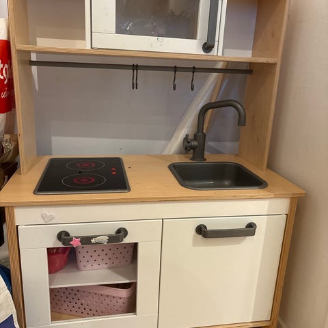 Säljer ett leksakskök från Kids Concept med massor av tillbehör pga flytt. Använt skick med små skavanker/skav i färgen på vissa ställen men verkligen inget som stör (skulle säga att det inte märks på håll och går att fylla i för den händige). Många tillbehör i generellt fint skick.