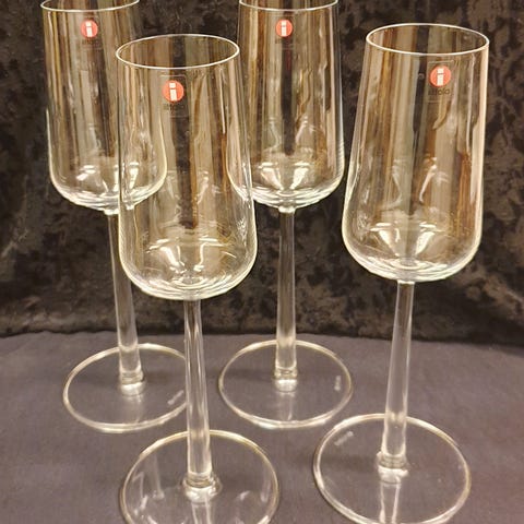 4 stycken vitvinsglas från Iittala av den populära modellen ”Essence”, designad av Alfredo Häberli. Kanske perfekt nu till julens måltider? Volym 33 cl. Höjd ca. 23 cm. Glasen är försiktigt använda och i mycket fint skick enligt mig. Samtliga glas har kvar Iittala-klistermärket, men märkena har tappat färgen lite.