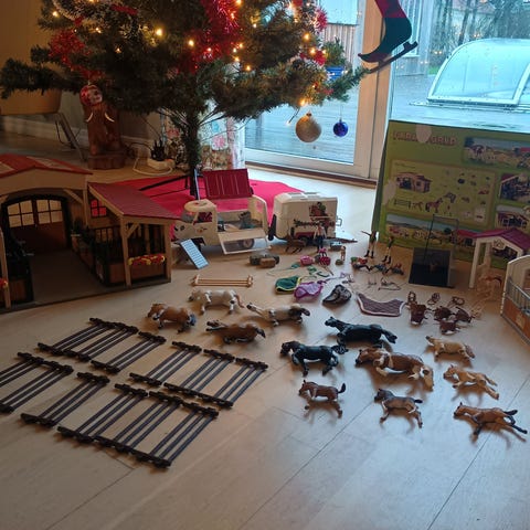 Allt som behövs för många timmars lek. Några märken i plexiglaset på taket på stallet (blivit när vi lagt det i låda med övriga byggnader). I övrigt mycket bra skick då dottern började samla på detta när hon var på väg att växa ut den åldern.