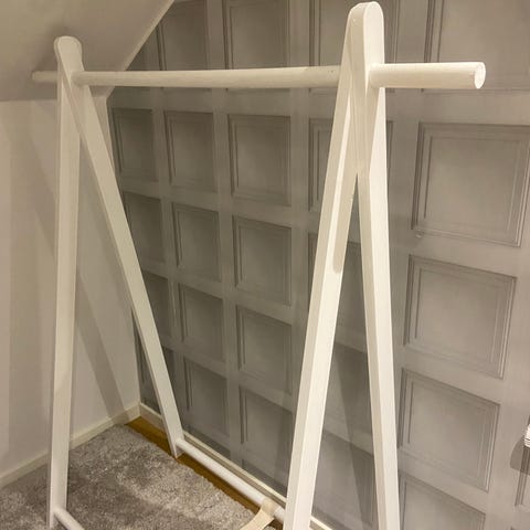 Klädhängare från IKEA som är luftig och tar lite yta, perfekt för det lilla utrymmet.