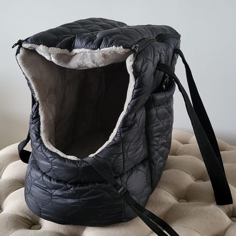 Trixie Hundväska med textmönster i svart och beige färg. Väskan är avsedd för transport av små hundar och har handtag för bärbarhet. Maxvikt 5 kg