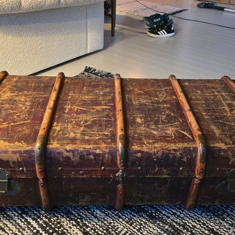 Resväska i rotting läderremmar saknas. Mått 62x36x15 cm
