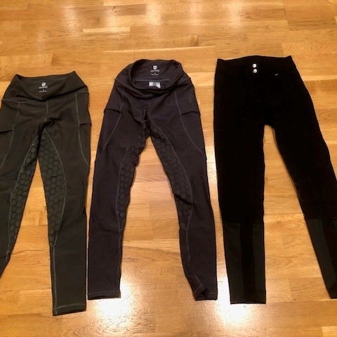 3. Gråa maya delorez ridbyxor, väldigt stretchiga och liknar tajts. Dom är hel skonade vilket ger ett bra grepp. Som ni ser på bilden så är det en liten lagning i sömmen, det är dock långt ner och med ridstrumpor så syns det inte alls. Storlek xs