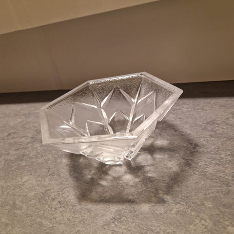 Iittala glas skål med sexkantig form och dekorativt mönster. Tillverkad av klart glas, lämplig för dekoration eller servering. Finns i Ingelstad, 2 mil söder om Växjö.
