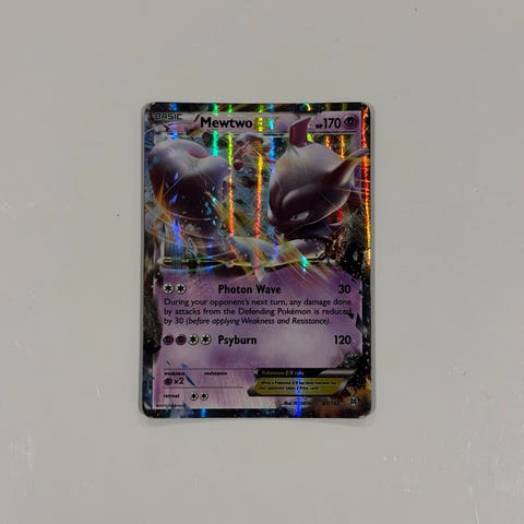 Pokemon Mewtwo GX samlarkort med illustration av Mewtwo och olika attack- och energivärden. Kortet är en del av Pokemon Trading Card Game.