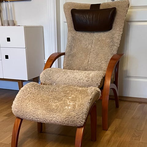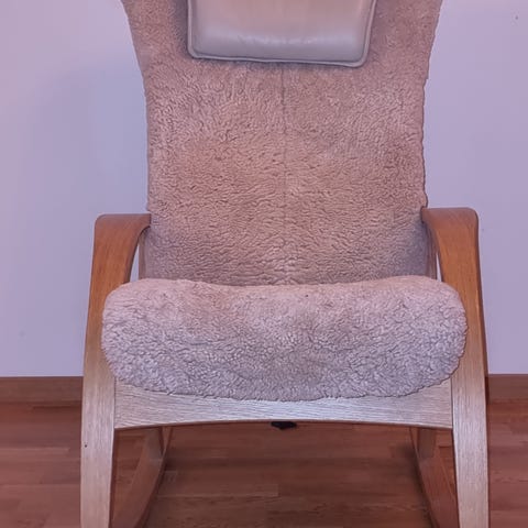 Brunstads sköna och lyxiga fårskinnsfåtölj Delta Swing. Går att luta/glida bakåt i, eller låsa i en favoritställning. Snurrbar. Reglerbar nackkudde i svart skinn. Framkanten på fårskinnet är slitet se bilder och läderöverdragen på armstöden har små klösmärken av en katt - annars i fint skick. Nypris 33 000:- säljs eller för en tiondel eller kom med ditt eget bud om det blir stort intresse.