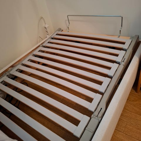 Handtag för att lättare komma upp från sängen. En del skjuts in under madrassen. Ben som står mot golv