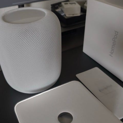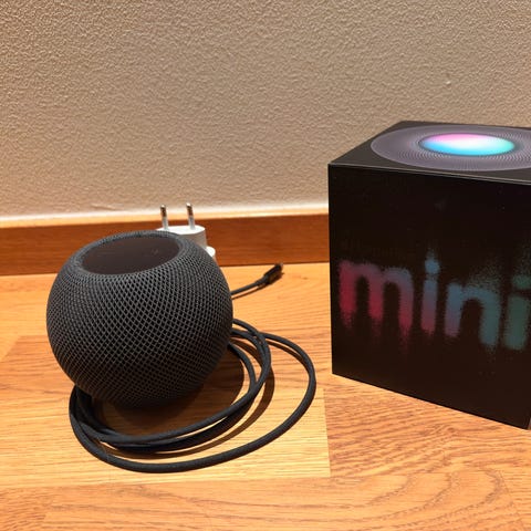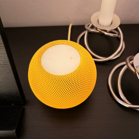 Apple HomePod Mini högtalare i gul färg. En kompakt smart högtalare med trådlös anslutning och nätkabel för strömförsörjning.