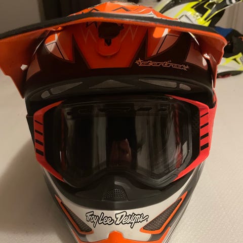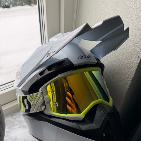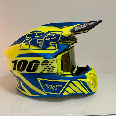 Airoh crosshjälm i svart färg med tillhörande gula skyddsglasögon. Hjälmen har inre vaddering och säkerhetsrem för justerbar passform. Produkten är avsedd för motocross och offroad-användning.