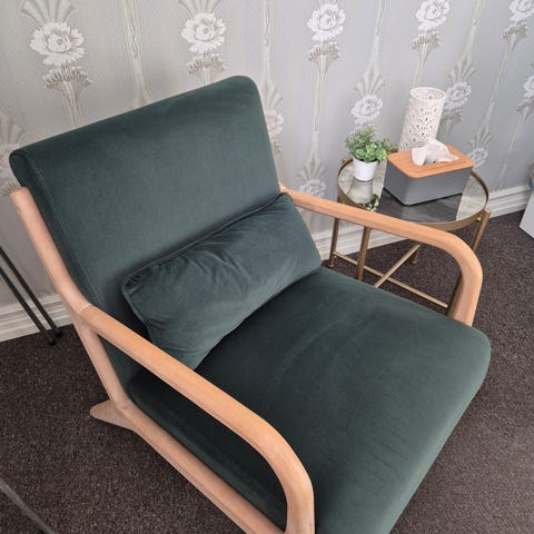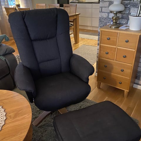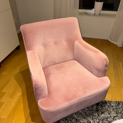 En beige fåtölj från Mio. Den är sparsamt använd och inte nedsutten.
