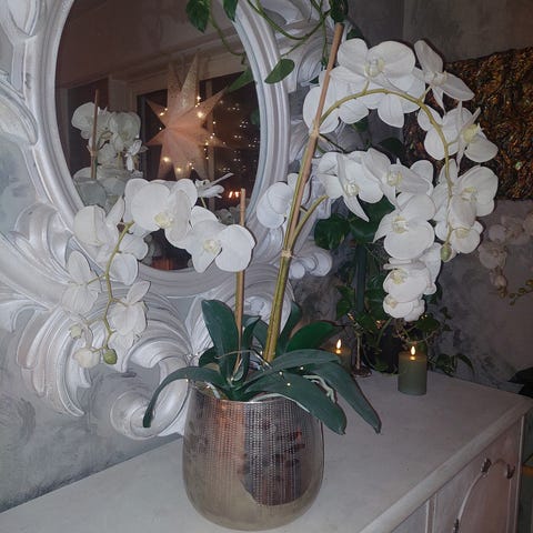Rusta konstgjord orkidé med etikett kvar. Dekorativ växt för inomhusbruk som inte kräver skötsel. Passar för att användas som dekoration i hem eller kontor.