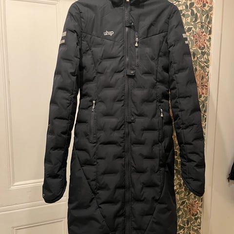 Blå ridkappa med huva och pälsdetalj. Kappan har fickor framtill och är vadderad för extra värme. Ärmlängden är lång och den är designad för att ge skydd mot kyla.