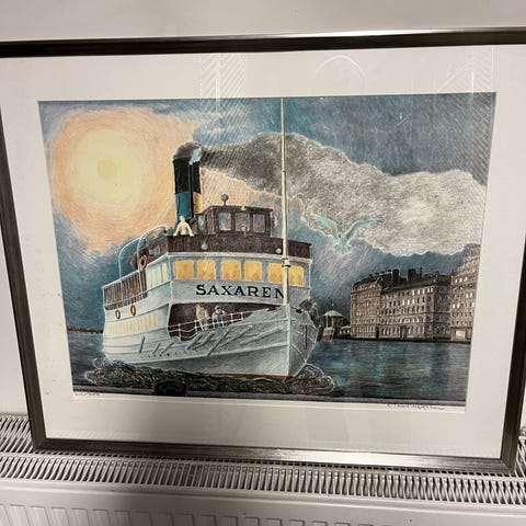 Reinhold Ljunggren Från Slottet till Slussen fotografi med fem originallitografier. Innehåller motiv från (Högvakten, Kungl. Slottet, Pontus Norbergsport, Mot Skeppsholmen)./Nu säljs Litografi Djurgårdsfärjan 5 till Djurgården.Blad L 53 x H 43 cm, Bild L 39 x H 28 cm. En 1 av 5 Litografier Signerad.