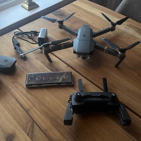 DJI Mavic 2 Pro drönare med 3 batterier, fjärrkontroll, laddare, bärväska och extra tillbehör. Drönaren är i kompakt design och används för fotografering och filmning från luften.