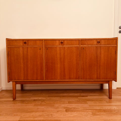 Retro byrå i Teak från mitten av 1900- talet. Med 4 stora lådor med ben i brun metall.