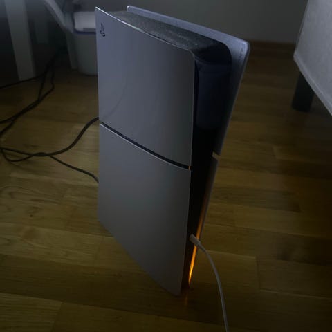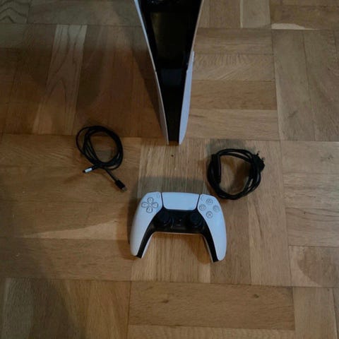 Playstation 5 spelkonsol med medföljande 2 handkontroll och strömkabel. Konsolen är vit och svart i färg , jag använder den 3 gånger