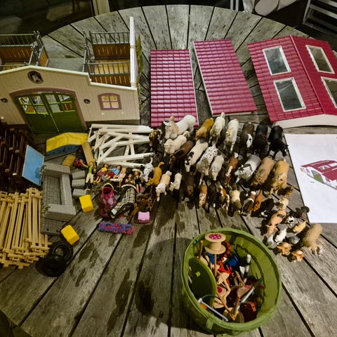 Bondgård med djur, stora leksaksfigurer av kvalitetsmärkena Papo och Schleich, 20 djur och 7 människofigurer samt tillbehör (höbalar, äpplen, grep etc). Alla i utmärkt skick, dock har den svarta hästen tappat en fot (han kan dock stå själv) och getabocken har tappat ett horn. Kor hästar, grisar m m. Lantgård av märke Le Van Toys saknar en av träpelarna men håller ihop bra ändå.