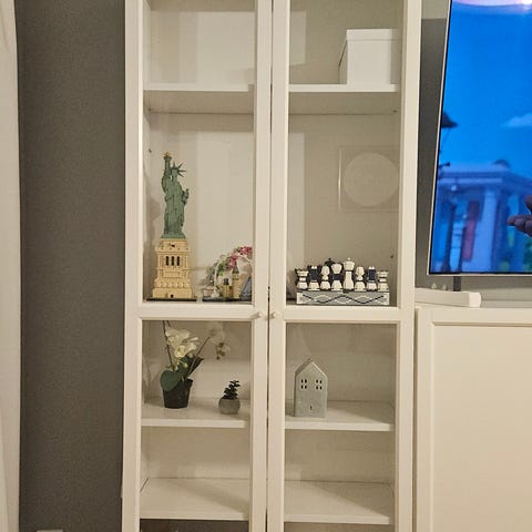 Litet och stilrent vitrinskåp i vitt med frostad glasdörr och två glashyllor. Passar utmärkt som förvaring eller display i hall, badrum eller vardagsrum.