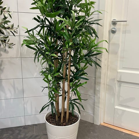 Två konstgjorda växter i kruka med gröna blad. En är en tät buskliknande växt och den andra en högre växt med smalare blad/olivträd. Båda är placerade i vita krukor och används som inredningsdetaljer.