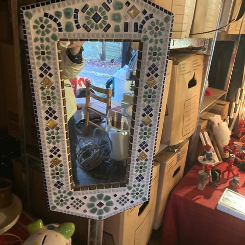 VÄGGSPEGEL, blyglas, Jugend, 1900-tal. Unik spegel med en vacker design. Den har färgade glasdetaljer i olika former och nyan-ser som ger en speciell karaktär. Perfekt som en dekorativ detalj i hemmet.