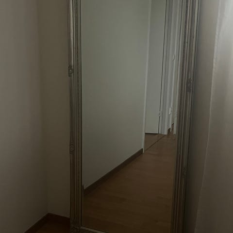 Spegel med ram i trä. Passar för väggmontering och kan användas i olika rum som hall, sovrum eller vardagsrum.