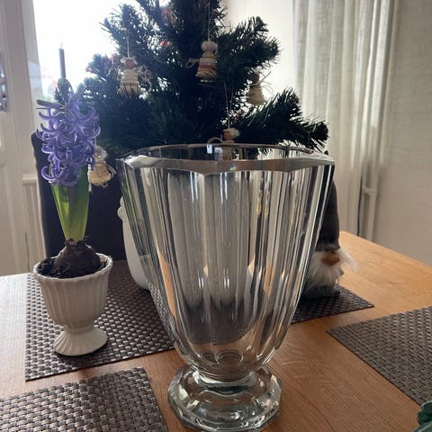Höjd 14cm, finns ett litet avslag i bottenkanten på höger sida.
