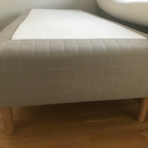 Resårbotten med fyra svarta fyrkantiga ben, sängen är 120 cm bred och är köpt från Jysk. Den är använd men i gott skick.