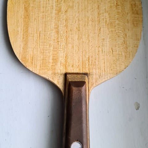 Retro pingisracket från 1995! Hittade min gamla racket från tonåren. DONIC Waldner trästomme (all+ eller off- med den tidens mått) med 2,0mm gummin Butterfly Sriver FX och Banda Waldi Clic. Gummina är så släta såhär efter drygt 30 år att de nog räknas som antispin. Slängt gummina som var helt slut. Men stommen går att restaurera för den som vill slipa och lacka lite. Skadorna på kanterna är ju inte snyggt men påverkar kanske inte spelet jättemycket med gummin.