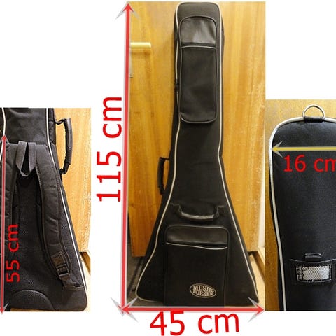 Gitarrfodral avsett för att skydda och transportera gitarrer. Fodralet är svart och försedd med handtag för enkel bärbarhet. Inget är trasigt men fyra klisterlappar sitter på.