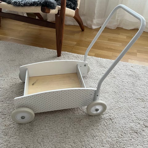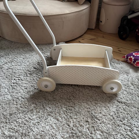 Stoy barnvagn i trä, vit färg. Designad för barn att leka och transportera leksaker eller mjukdjur. Har handtag och fyra hjul för enkel förflyttning.