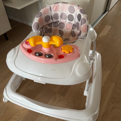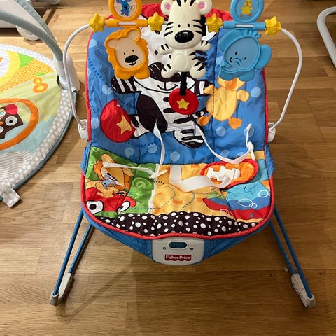 Ryggstöd som är ställbart i 4 lägen, handtag för att lätt kunna bära den med sig samt ställbara fötter för att växla mellan gungande och fast läge.