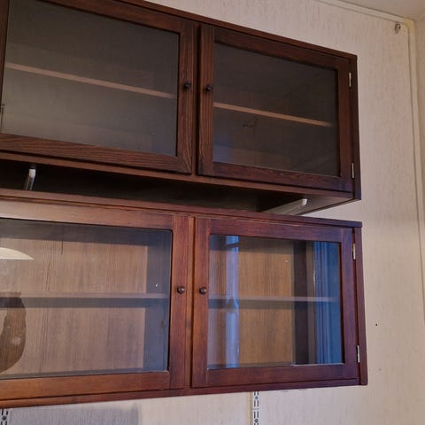 Vitrinskåp med fyra lådor var o två glashyllor var