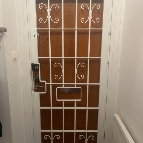 Svetsad passbit mellan grind och dörrkarm – kan behöva lite färg om man vill behålla den.