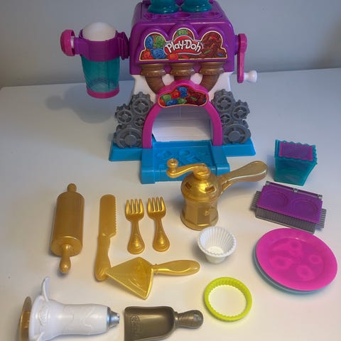 Play-Doh lekset för barn innehåller flera färgglada tillbehör och verktyg för formning och lek. Setet inkluderar olika formar, en mixerliknande apparat, en kassalåda och andra redskap i plast. Lämpligt för kreativ lek och utveckling av finmotorik.