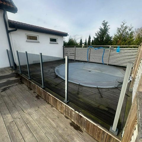 Priset är 1500kr/meter. Då ingår glas och monteringsdetaljer (kostade 270kr/fäste). Skruven som medföljer är till för infästning i trä, men det går att köpa samma skruv med fingängor avsedd för metall och använda tillsammans med befintliga monteringsdetaljer. Skruven har torx-spår.
