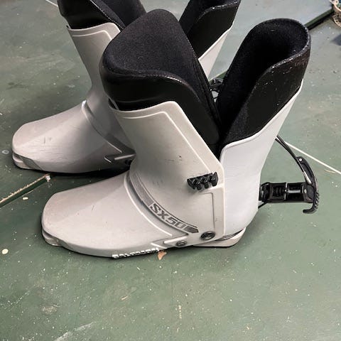 Slalompjäxor Nordica. Använda några sportlov men väldigt lite eftersom jag hade andra pjäxor som jag hellre använde. Bekväma och har många spännen så passar de flesta. Man kan justera lutning, flex mm med olika reglage som lätt ändras med insexnyckel (”Ikea-verktyget”), så de funkar både nybörjare och medelgoda åkare. Bra skick men har så klar en och annan ytlig repa. Fräscha för jag har använt mina specialgjutna sulor.